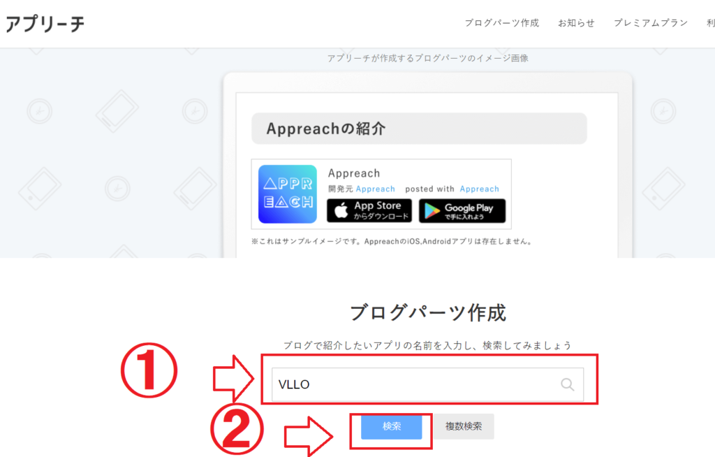 ①アプリ紹介パーツを作成したいアプリ名を入力し、②検索します。