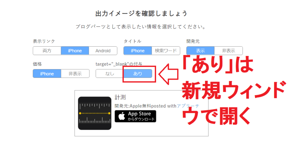- 「あり」を選択:別のウィンドウ(新規タブ)