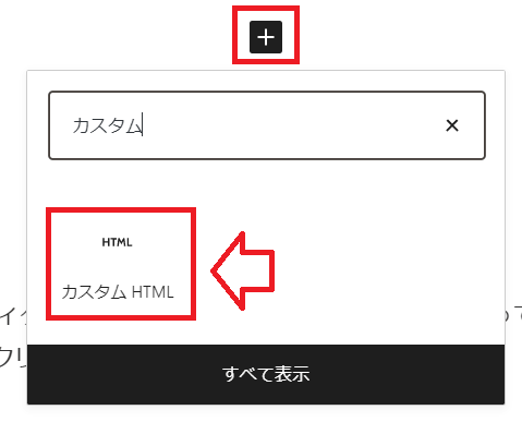 ワードプレスの新エディタ(Gutenberg(グーテンベルク))を使用している場合は、「ブロックの追加」>「カスタムHTML」をクリックします。