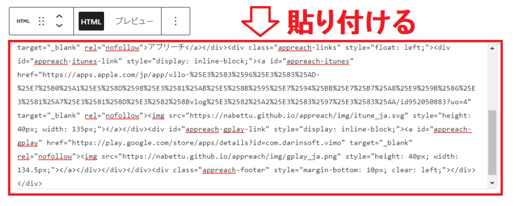貼り付け後、「プレビュー」をクリックすると、アプリ紹介ブロックが表示されます。