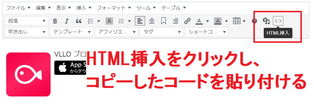 旧エディタを使用している場合は、記事投稿画面で右上の「HTML挿入」ボタンをクリックして、コピーしたコードを貼り付けます。