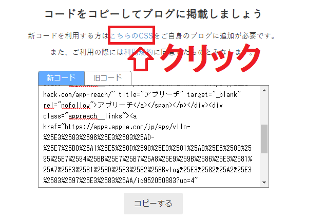ページの真ん中にある、新コードを利用する方は「こちらのCSS」をご自身のブログに追加が必要です。までいきます。