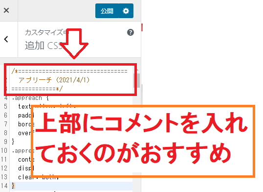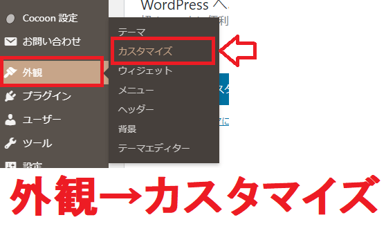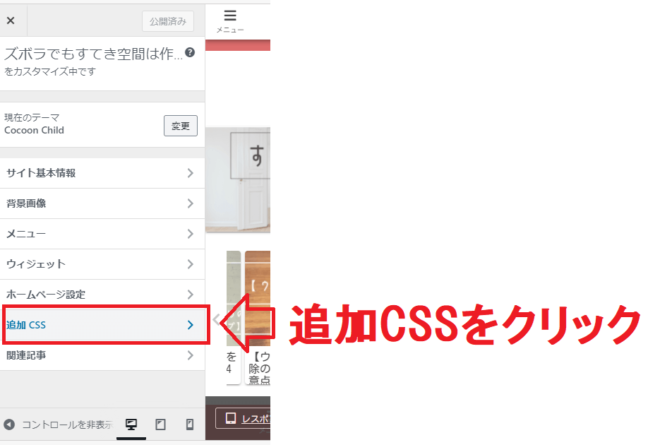 ワードプレス管理画面から[外観]→[カスタマイズ]→[追加CSS]と進みます。