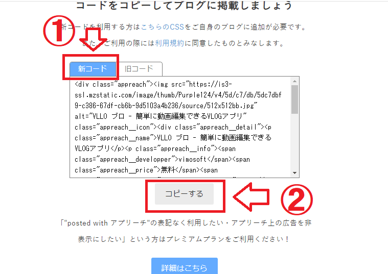 ①「新コード」にタブをあわせ、②「コピーする」をクリックします。