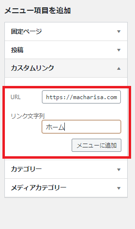 [メニュー項目を追加]から、「カスタムリンク」を選びます。