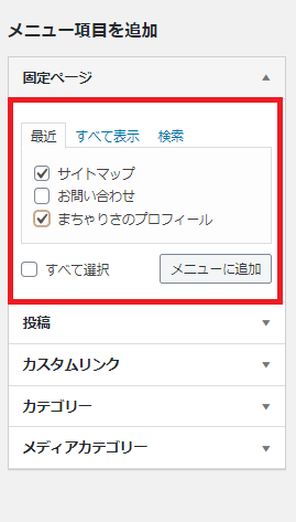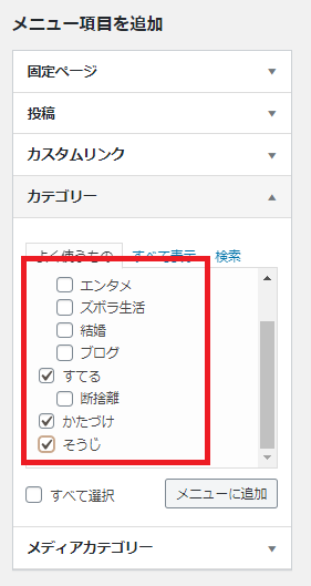 [メニュー項目を追加]の「カテゴリー」から、好きなカテゴリーにチェックを入れ、「メニューに追加」をクリックします。