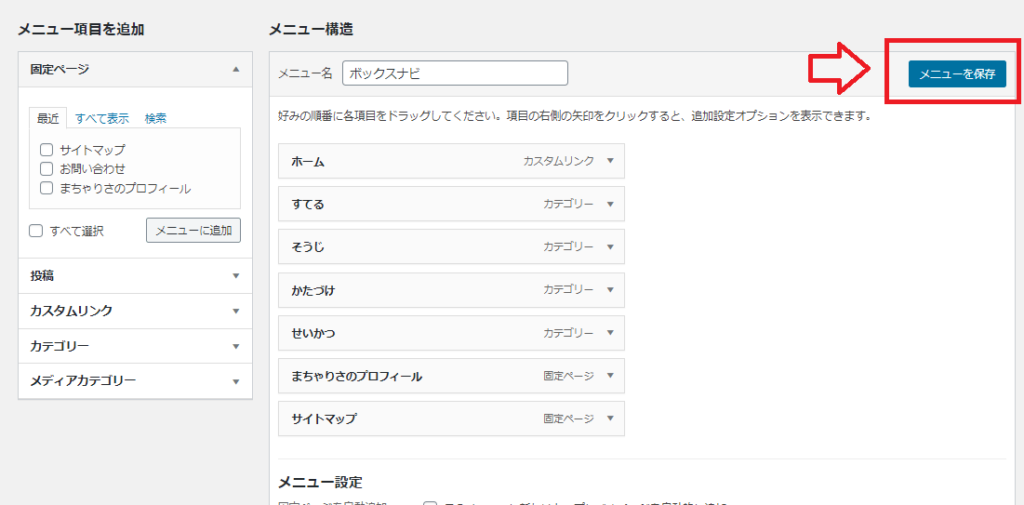 最後まで設定したら、[メニューを保存]をクリックします。