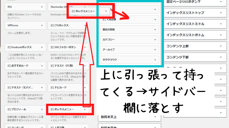 左側から「[C]ボックスメニュー」を探し、右側にある「サイドメニュー」へ向かってドラック&ドロップします。