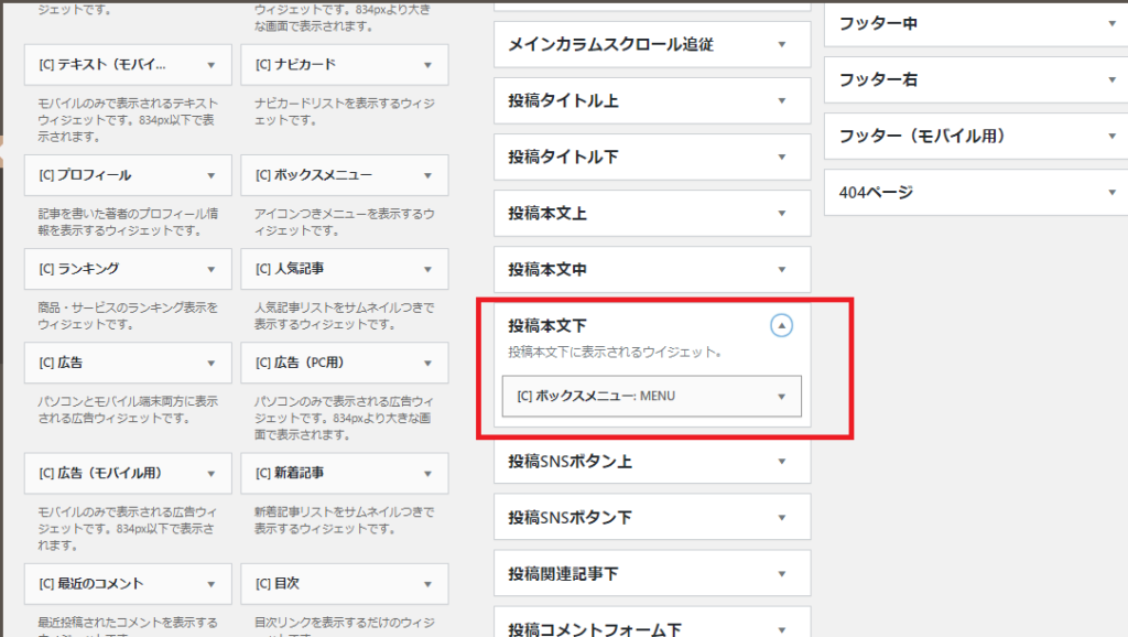 作成したメニューをサイドバーの「ウィジェット」に設定していきます。