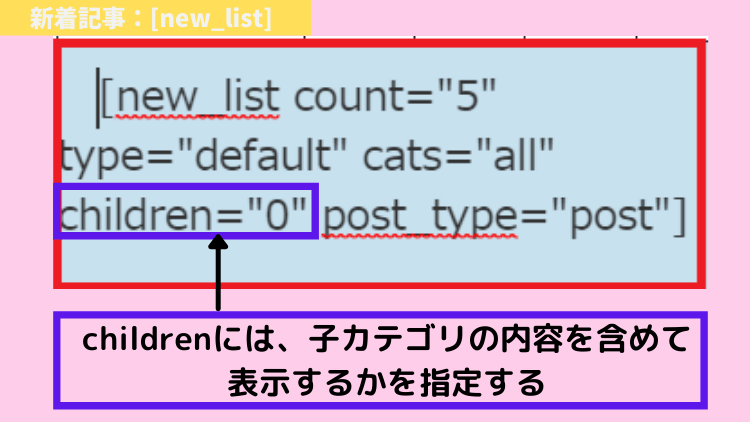 childrenは、子カテゴリの内容を含めて表示するかを指定します。
