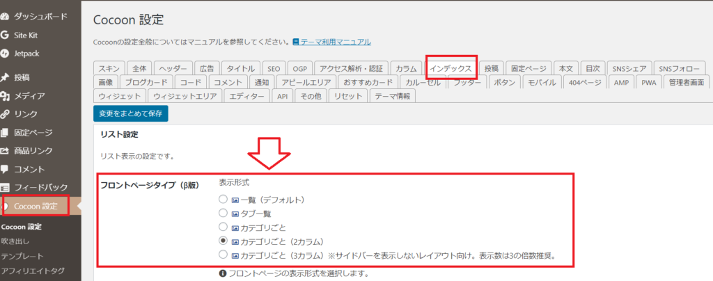 Cocoonでトップページをサイト型に変更する手順は、次の3つです。