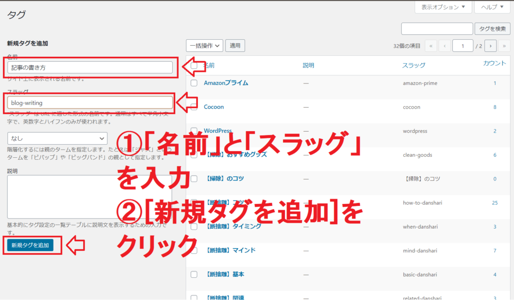 ① 「名前」と「スラッグ」にタグ名称を入力する