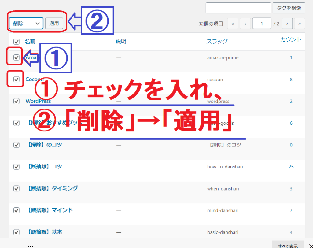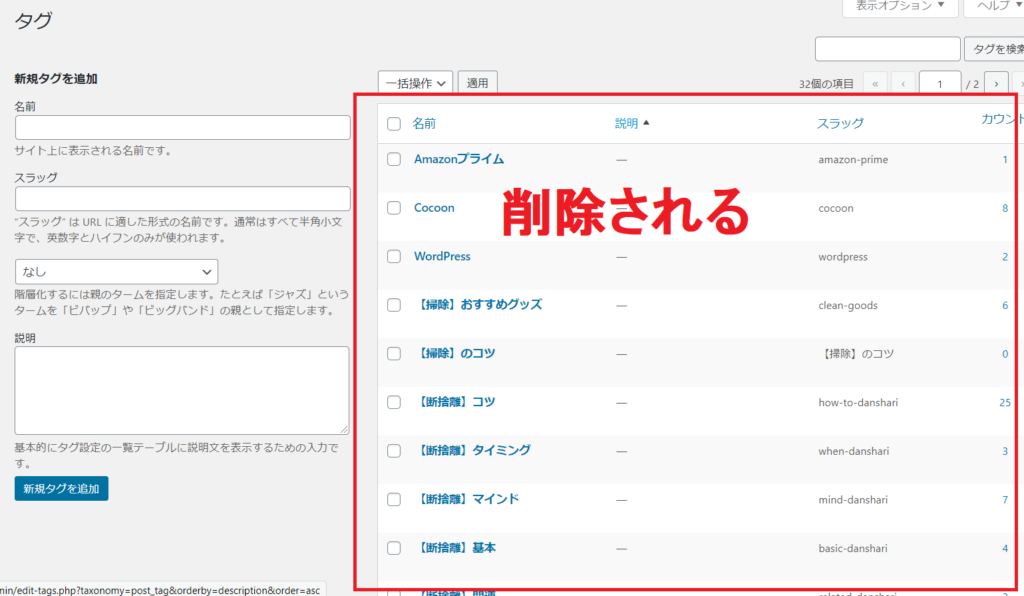 カテゴリーでは親と子の階層構造を持ちますが、タグはただの「札」「付箋」なので、階層構造は持ちません。
