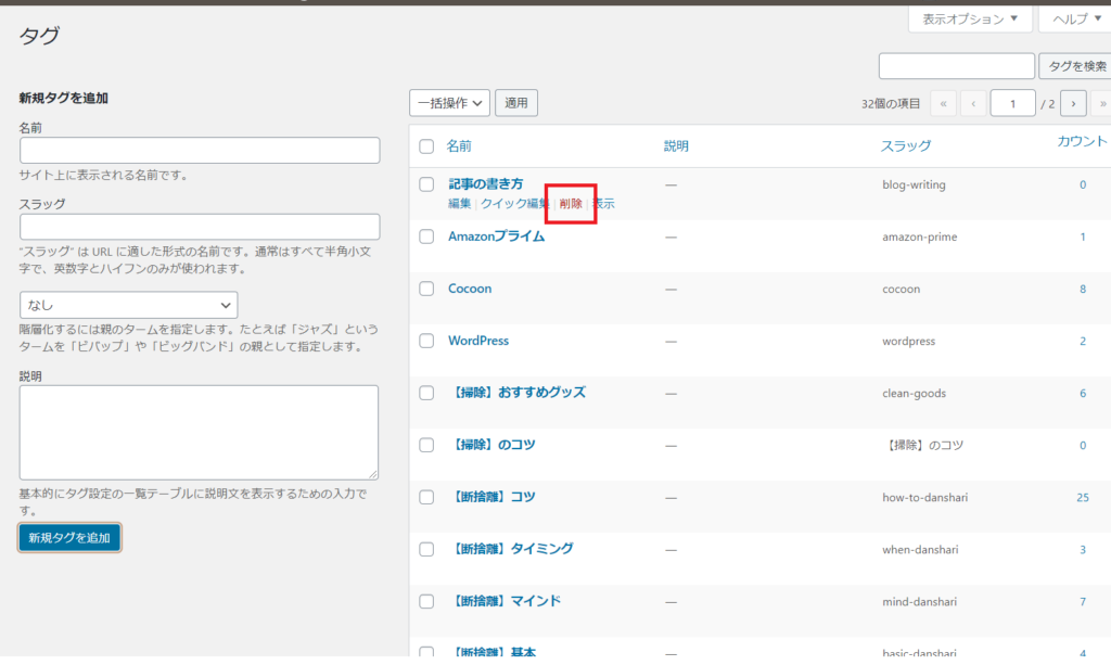 タグを削除する場合は、追加したタグにカーソルを合わせ、表示される[削除]をクリックします。