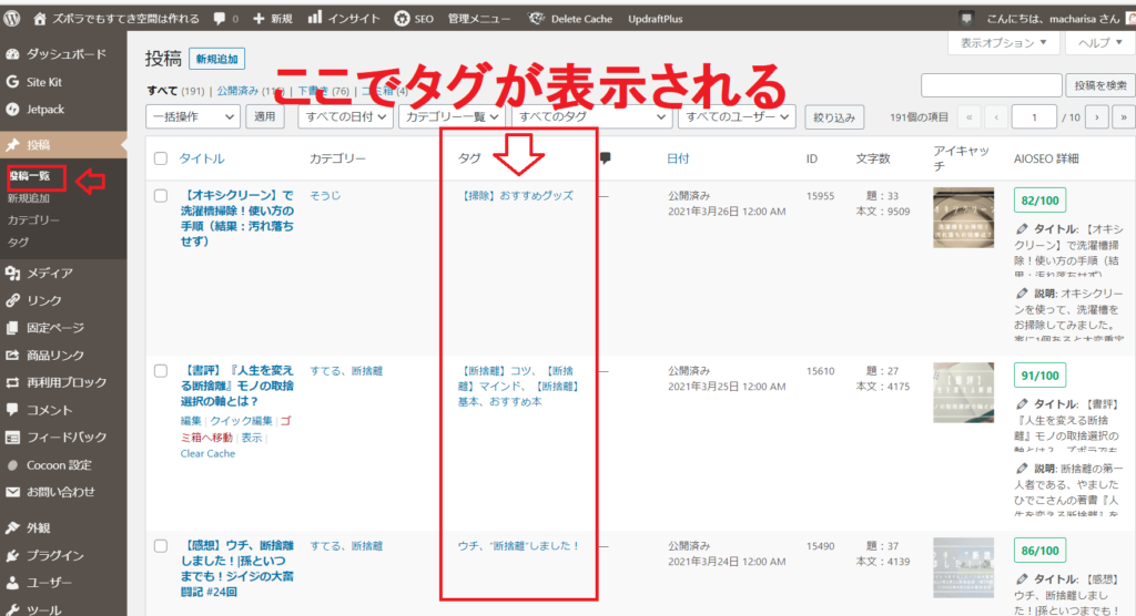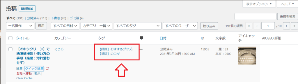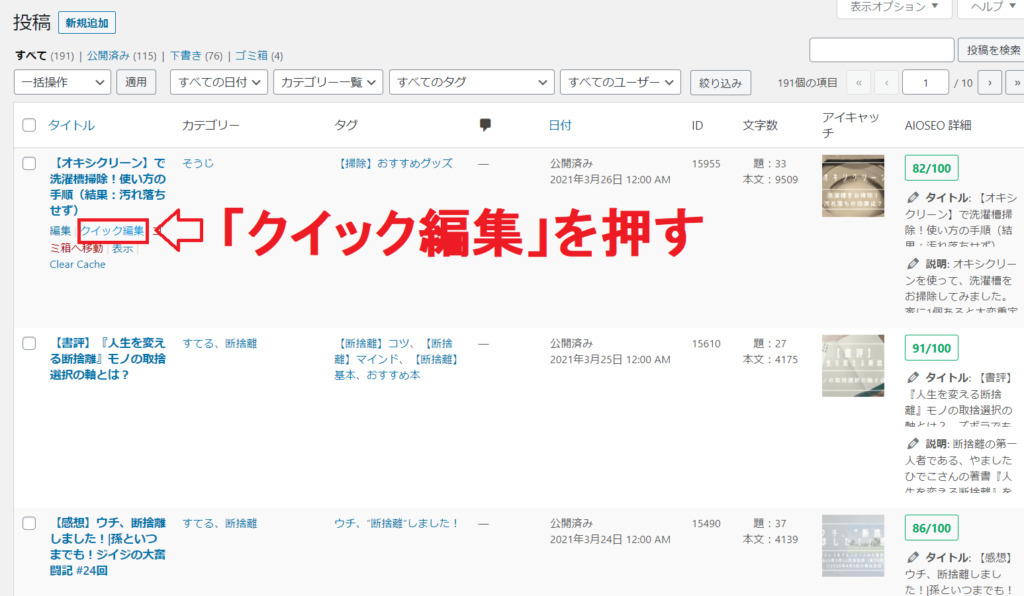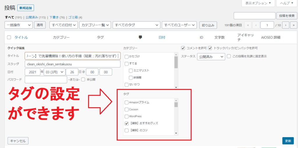 「クイック編集」を使えば、投稿記事にタグを追加できます。