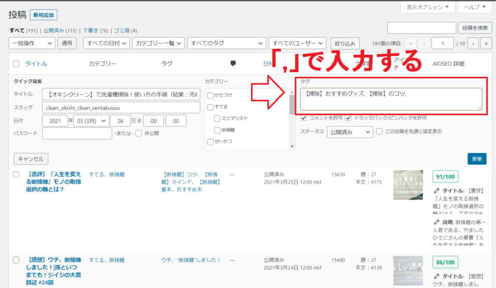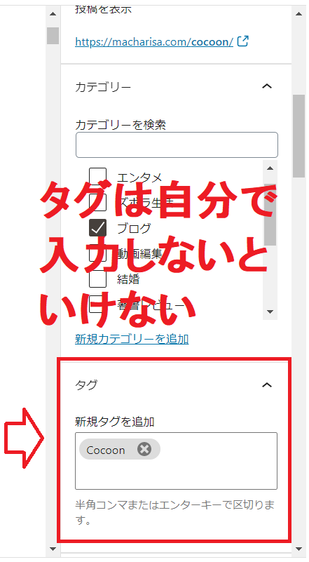 記事投稿画面でも、同様、タグは「,(カンマ)」をつけながら入力が必要です。