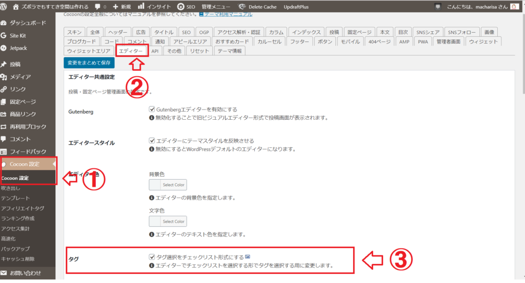 Cocoonの設定で、タグをチェックボックスで選択できるようになります!次で設定していきましょう。