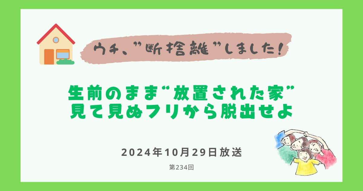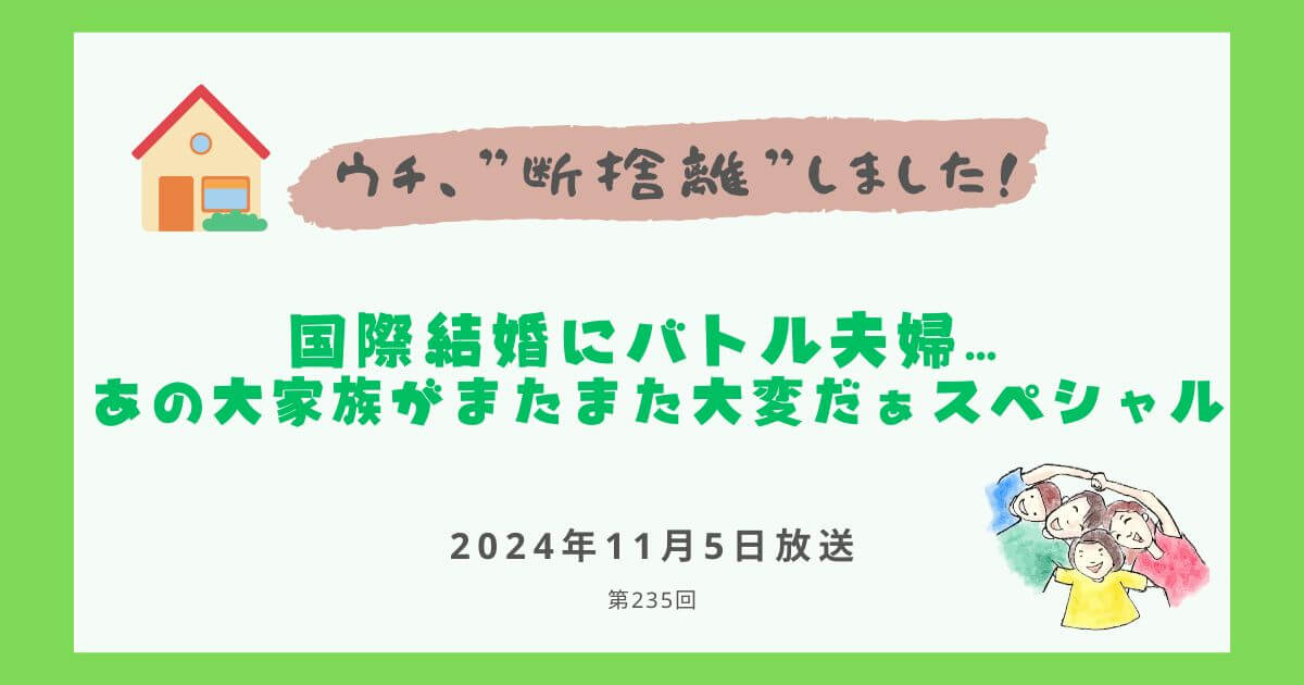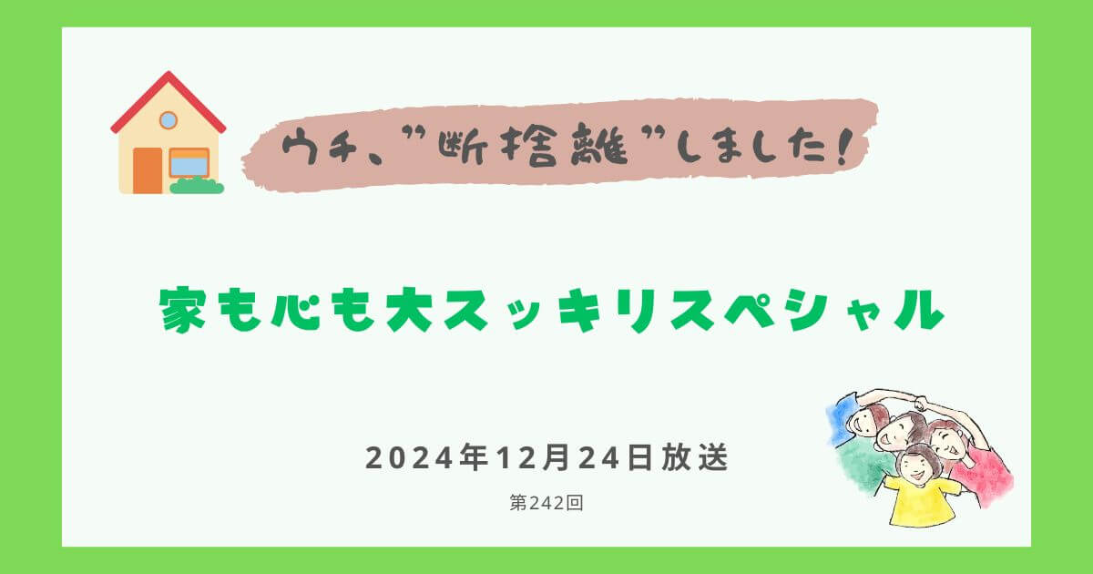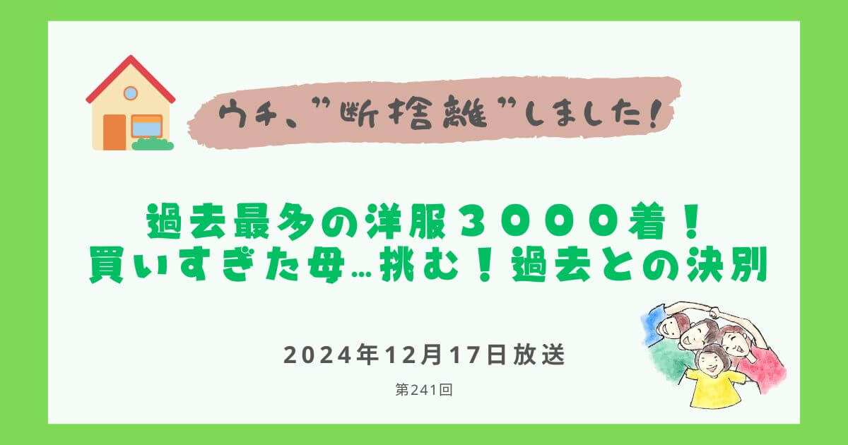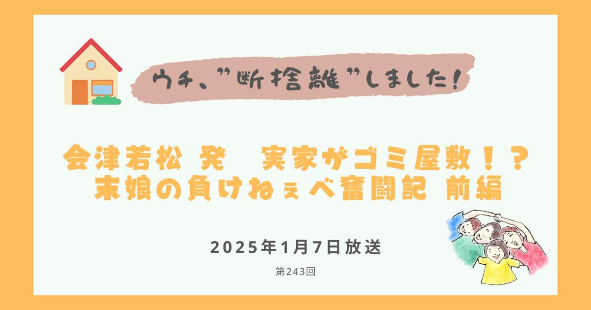 こんにちは、まちゃりさです。本記事では、BS朝日「ウチ、”断捨離”しました!」2025年1月7日放送回(第243回)の内容・感想をまとめます。今回は、ゴミ屋敷寸前な実家の断捨離物語(前編)です。 ↓後...