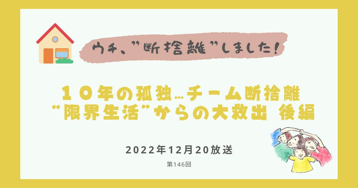 本記事では、BS朝日「ウチ、”断捨離”しました!」2022年12月20日放送回(第146回)の内容・感想をまとめます。